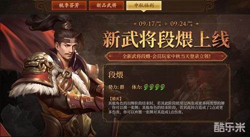 划重点!!!VIP玩家在9月21日中秋节当天登录游戏,还将获得专属答谢礼——新武将段煨!免费领取的机会怎能错过?是时候记入日程,第一时间领取你的专属武将了!