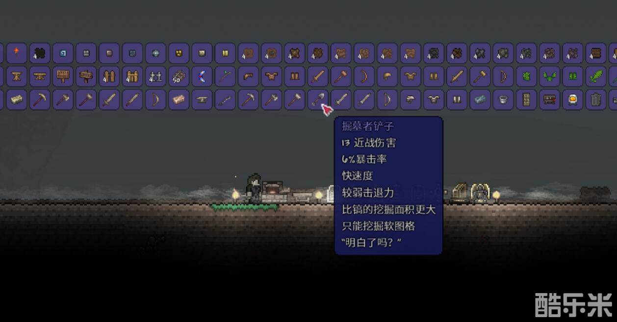 掘墓人之铲这个前期一定需要一个,10个铁锭(20个铁矿)+任意3个木材在墓地环境的铁站下制作,它可以一次性挖3*3个土块(石块无效),同时具有和钨宽剑一样的伤害与攻击速度,同时还有更大的挥动范围(铲子攻击范围大),所以可以拿来作为前期一个好用的武器。