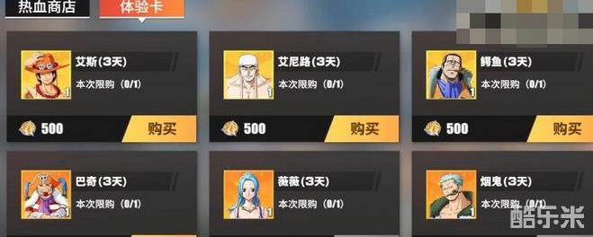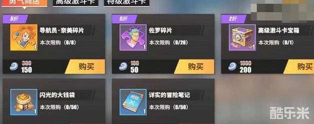 该商店兑换需要勇气点的,玩家可以通过勇者挑战来获取,在该商店中,玩家可以兑换一些紫色的激斗卡,主要就是因为紫色的激斗卡容易完成,然后再循序渐进的变成橙色激斗卡,如果玩家在后期紫色卡已经够了,就可以兑换贝里了,到了后期是很稀缺的东西!