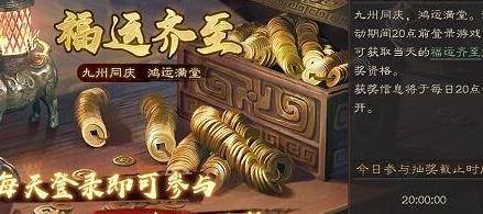 活动内容:九州同庆,鸿运满堂,活动期间20点钱前登录游戏即可获得当天的福运齐至抽奖资格!