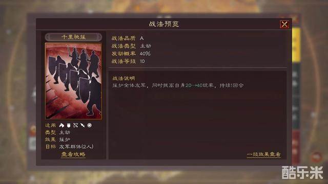 比如皇甫嵩带千里驰援就可以保护友军,提升反击输出伤害量;比如程普带千里驰援可以给随机敌军单体造成震慑状态,每回合有三次机会可以释放,总有概率可以成功控制敌军一人。
