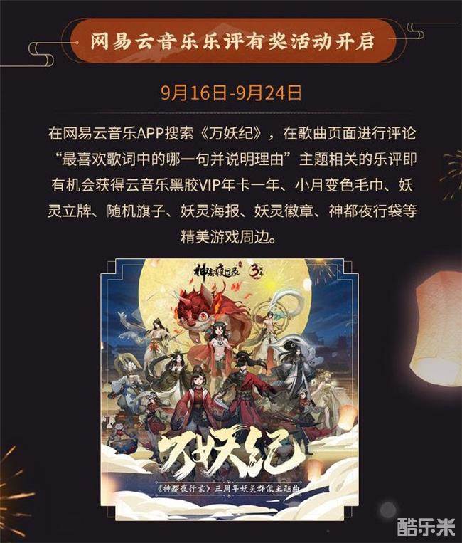 除了《神都夜行录》游戏中的层层福利之外,微博与网易云音乐平台也为降妖师准备了专属活动。微博平台“幸运大转盘”活动是通过抽奖形式送出丰厚游戏大礼,线上礼包与“三周年庆礼盒”等实体周边惊喜全面覆盖。以及“微博粉丝专属福利”,是通过口令兑换不同奖励。网易云音乐平台活动则是通过听歌赏词之后在收听页面写下自己的感想乐评,即有机会赢得各种精美周边以及黑胶VIP年卡。