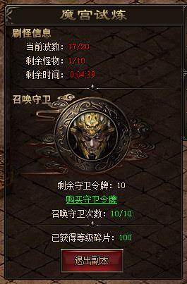 玩家进入到魔宫试炼副本后,需要点击右侧的召唤守卫按钮,来召唤一些守卫协助战斗,消灭副本所刷新出来的怪物。玩家每次进入副本,系统会自动赠送5个守卫令牌给玩家,玩家可以消耗钻石,来额外购买守卫令牌使用。