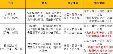 首回合:优先击杀和封印其他输出人物,否则对面鬼王主将起手飞机或者青云主将群秒。很可能直接带走多个人物和宠物,和主将输出联动会导致直接被打崩。哪怕集火的其他人物第一回合没有秒掉,第二回合也要一个到两个灵兽集火估算伤害把他点掉。