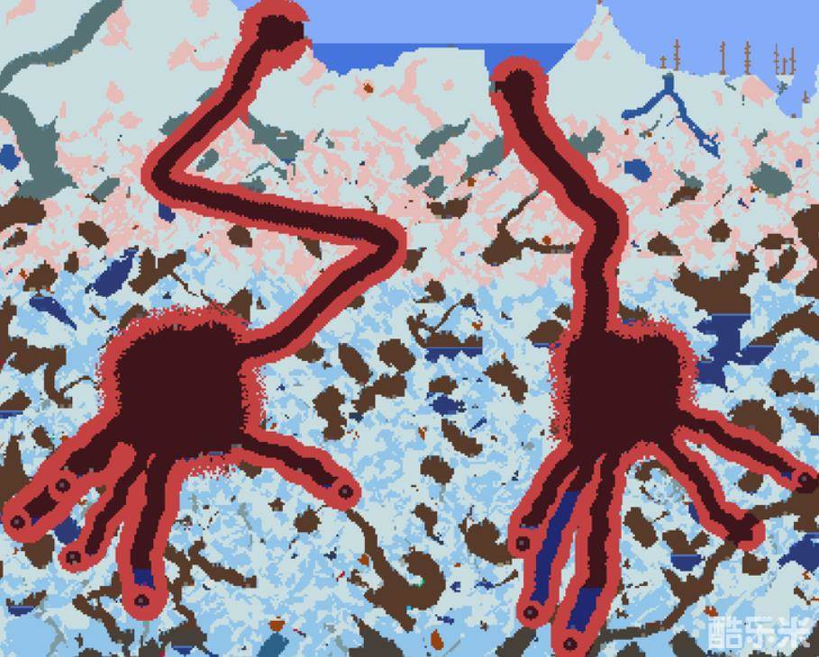 腐化纵深深坑直下后地形横向伸展,猩红是纵深折弯向下后镂空一个多边形。