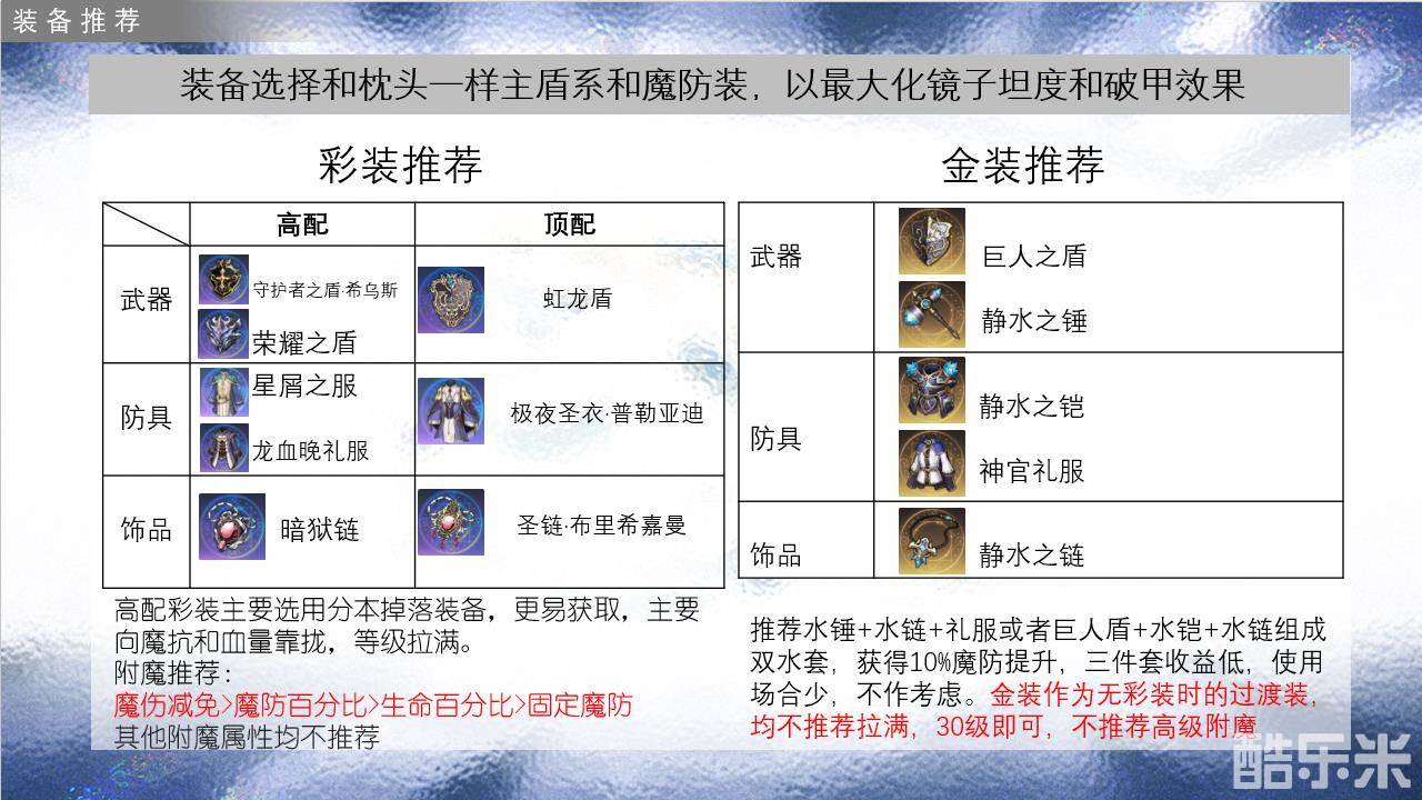 金装方面,我更加倾向于推荐拿大地套,因为镜子防护能力的来源是1技能的护盾。