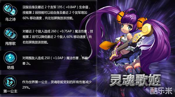 冰杖还很适合灵魂歌姬装备。主要由于灵魂歌姬的甩葱歌技能:对最近2个敌人造成260(+0.75AP)魔法伤害,技能第2段可以降低最近2个敌人60%移动速度。装备冰杖以后灵魂歌姬甩葱歌技能两段都能造成减速,第二段减速效果加强,对于敌人来说几秒内几乎处于无法移动状态,造成了致命打击。
