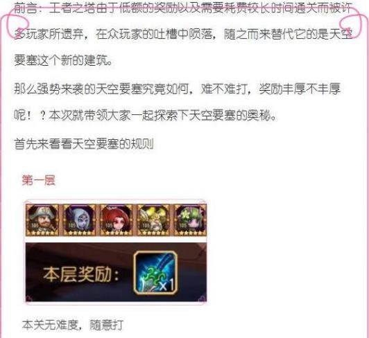 小冰冰传奇天空要塞奖励大全!小冰冰传奇天空要塞奖励一览由酷乐米小编给大家带来,小冰冰传奇王者之塔由于奖励收益较低,同时耗费时间一直被玩家所忘记的玩法,近日官方更新,用小冰冰传奇天空要塞取代了王者之塔,王者之塔1-20层有着不同的道具和材料奖励,那么小冰冰传奇天空要塞有什么奖励?