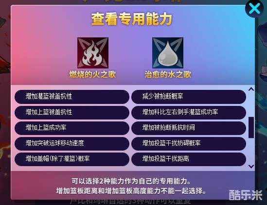 角色可以从30种辅助能力中选2种作为专用能力(篮板距离增加和篮板高度增加不能同时选择,2个角色是各自独立选择)