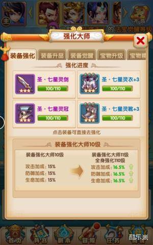 PS:每提升5级,装备可以强化10级,得到装备大师的提成属性,对提升战斗力会有一定的帮助。