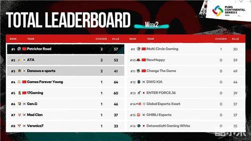 与GFY战队相似,17战队虽然在首周的比赛中暂时无缘奖金,但在本周比赛中迎来了状态的回归,首局比赛便拿到13个淘汰。后面的比赛中,17战队也是渐入佳境,在首日第五局比赛中,他们势如破竹地以12个淘汰拿下胜利。两天下来,17战队总共收获60个淘汰,仅次于GFY战队,而1个吃鸡数也帮助17战队获得了本周的第五名。