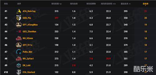 在淘汰榜上,ATA战队的Rain1ng以21个淘汰获得淘汰王称号。上周的淘汰王——Gen.G战队的Pio选手手感不减,本周以20个淘汰数再次上榜。此外,拿到最多淘汰数的GFY战队也有两人上榜,分别是ATongMuu和911x。