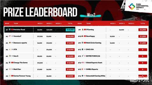 本周的排名奖金相比于第一周有所增加,获得周冠军的PeRo战队一骑绝尘,本周收获$20000的奖金,并以$25000的总奖金暂列榜首。上周的周冠军V7战队本周凭借最后一局比赛的胜利,以$20000的总奖金数位居第二。同样来自PWS赛区的DNW、ATA、Gen.G战队分别以$14500、$14000和$13500的奖金数分列三到五名。上周的亚军CTG战队本周虽无建树,但仍以$12000的奖金排名第六。
