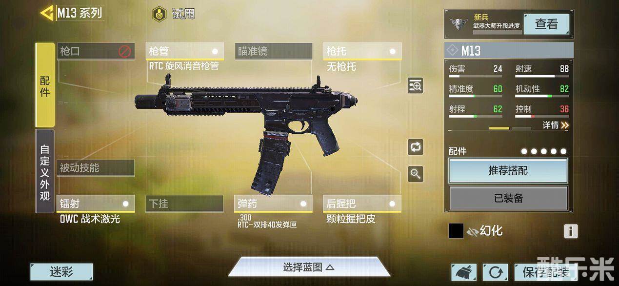 再装备颗粒握把皮来缩小举镜子弹散布,提升中距离精准度,最后配置.300 RTC-双排40发弹匣,来延长M13的射程和子弹速度,并且提升架点续航的能力。