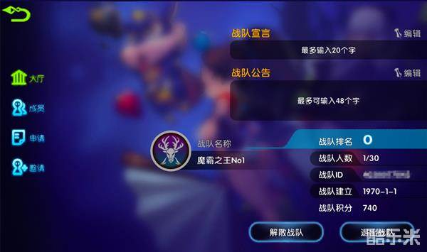 战队创建成功以后可以查看战队成员信息,修改战队宣言和战队公告,查看战队申请。目前魔霸之王的战队规模是30人。