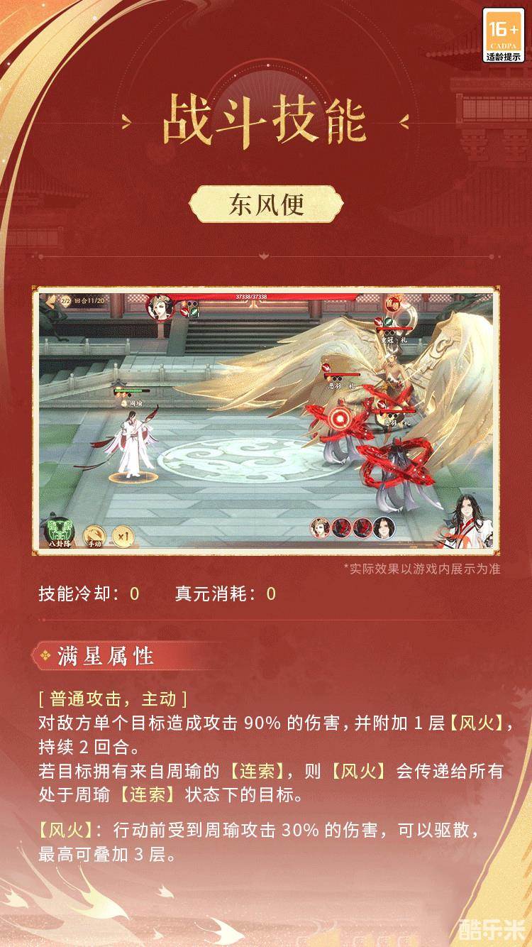1、普通技能--东风便(普攻)--对1名敌方造成90%伤害,并附加1层(风火),持续两回和。若目标拥有(连锁),则(风火)会传递至所有处于周瑜(连锁)状态下的目标。