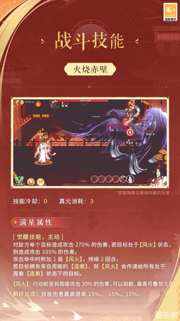3、觉醒技能(3火)--火烧赤壁(3火觉醒)--对敌方单体目标造成270%的伤害,若目标处于(风火)状态,则造成330%的伤害。攻击命中时附加1层(风火),持续2回合。