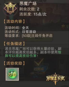 恶魔广场可以说是游戏中最好的练级宝地,(相对血色我更喜欢这个)一定要善加利用。同样恶魔每天可以进入3次。奖励机制和血色差不多,副本评价越高经验越高。这里一样使用鼓舞提升伤害,提高VIP等级买更多副本次数,早买早升级。