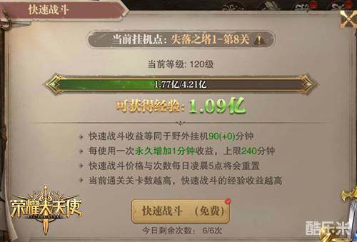 快速战斗,很多萌新还不晓得什么意思。这里解释一下,快速战斗相当于另外一种挂机,就是点了之后随便你干什么,等到一定时间它就会给你挂机时间的所有经验和奖励。现在我们每天都有六次快速战斗的机会,包括免费次数和钻石次数,提升vip等级可以额外增加次数。 重点是如果通关数越高,快速战斗收益就越高。所以建议每天游戏里先提升战力,再挂关卡,最后再考虑快速战斗,让收益最大化。