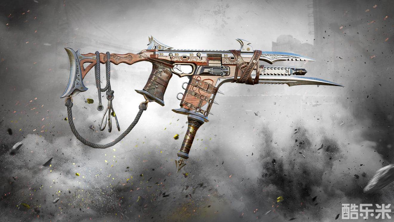 Fennec-刀工艺术的上下枪管,皆配有尖锐小刀,红木枪身上包裹着绘有复杂花纹的皮革,并捆绑着一排匕首,枪托尼龙绳的末端挂钩极为锋利,不怒自威。