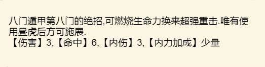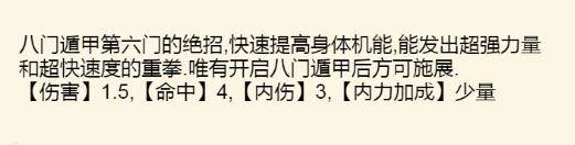 特殊效果:提高自身臂力身法,状态持续期间受到致命伤时回复10%的生命与内力