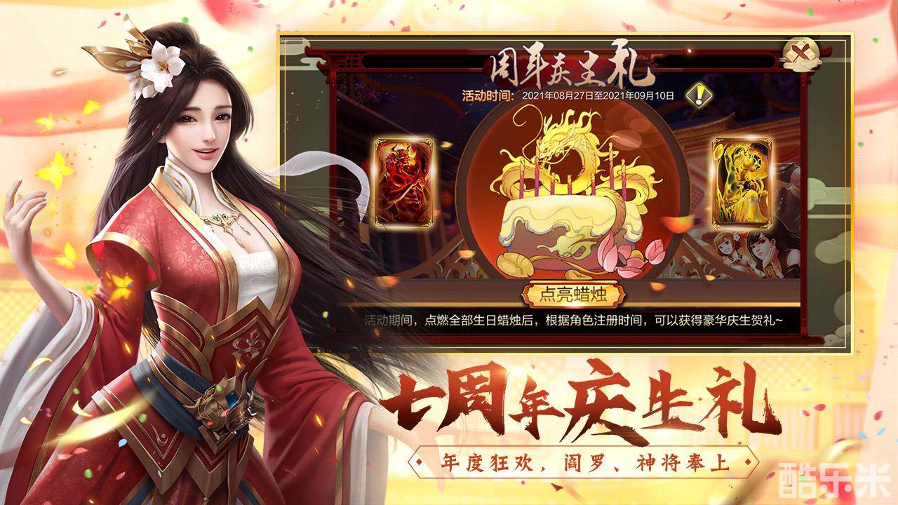《天龙3D》七周年庆典,年度狂欢,福满江湖。周年庆生礼,福利大放送,元宝、坐骑碎片、武魂碎片等好礼点击即可领取,更有绝世武相【十殿阎罗】碎片免费领取,周年狂欢,福利无限!少侠还等什么?快来游戏内领取你的庆生礼!
