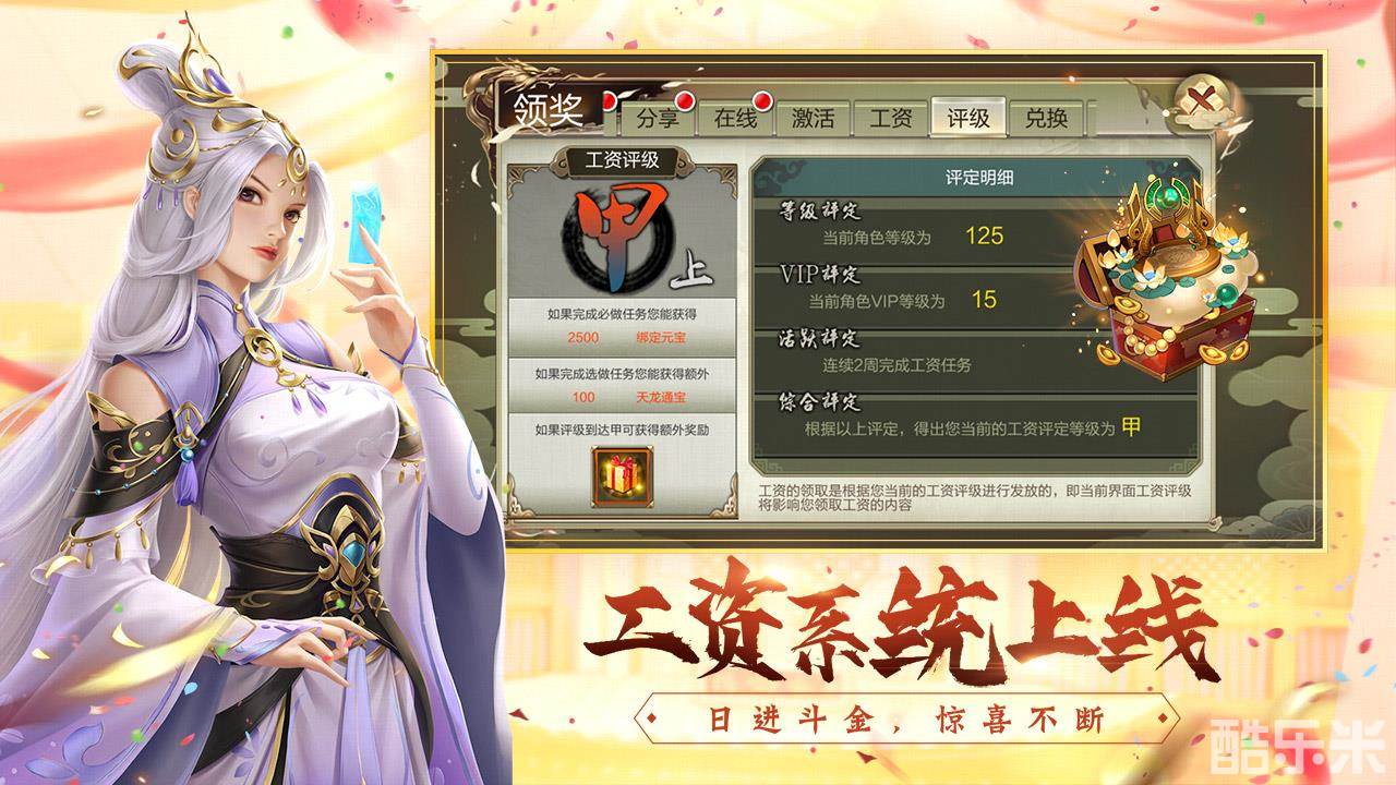 全新玩法工资系统上线,做任务送元宝,日进斗金,坐享其成,每周完成必做任务即可获得奖励!完成可选任务、特殊任务将会得到额外的绑元和【珠光宝箱】奖励,惊喜不断,福利多多!