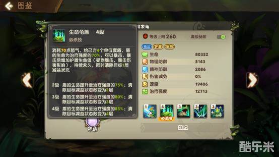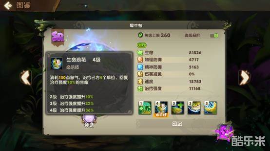 看回犀牛鲸,如果过说蜥尾鹰是纯粹的攻击的话,那么犀牛鲸就是纯粹的治疗。这是一个连普攻都是回血的宠物,配合【鲸脂】的存在,自带20%连击率,非常可观。必杀技【生命浪花】更是能够同时治疗4个单位,回复最高106%的治疗强度。并且【鲸息】的存在,能够进一步提升抬残血队友的能力。可以说,除了复活队友外,犀牛鲸是一个非常可靠的“航空母舰”,带来如同它身形一般可靠的续航能力。在跨级攻关面对犀牛鲸强大的回血能力时,有时候会让人非常绝望。