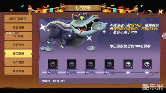 疯狂打造银币活动周期性循环。第一轮次的主题是疯狂打造!只要使用酋长挑战券就可以打造银币*1,如果使用悬赏挑战券就可以获取银币*4。另外可以通过钓鱼,使用【水产兑换】系统,每兑换一个龙虾,可以获得打造银币*1。当然还有最最重要的,银币返还活动,可以返还大量的银币,千万不要忘记领取!