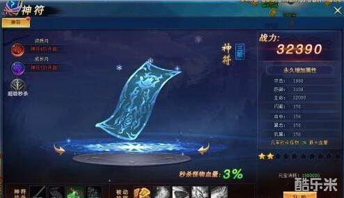 1.3 神符秒杀 神符系统开启后,玩家在攻击BOSS时,有概率触发秒杀 秒杀效果:对目标BOSS造成百分比最大血量伤害 通过神符升阶,可提升秒杀造成的最大血量伤害百分比 秒杀触发概率固定,购买成长特惠礼包,即可大大提升触发概率 。不懂的小伙伴也可以到