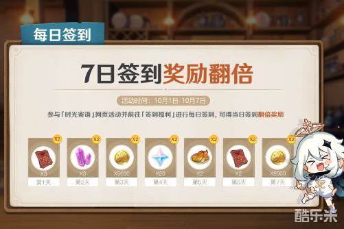 所有成功参与「时光寄语」网页活动的旅行者,10月1日-7日前往米游社-签到福利进行每日签到,均可获得当天的签到翻倍奖励!