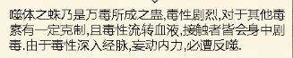 噬体之蛛乃是万毒所成之蛊,毒性剧烈,对于其他毒素有一定克制,且毒性流转血液,接触者皆会身中剧毒,由于毒性深入经脉,妄动内力,必遭反噬。