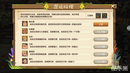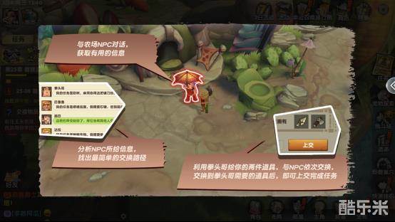 酋长需要根据农场各位居民对话,获取有用的信息,找出合理的交换路径,结合拳头哥给的两件初始道具,与农场各位居民一次交换,直到交换拳头哥需要的道具后,即可上交完成任务。