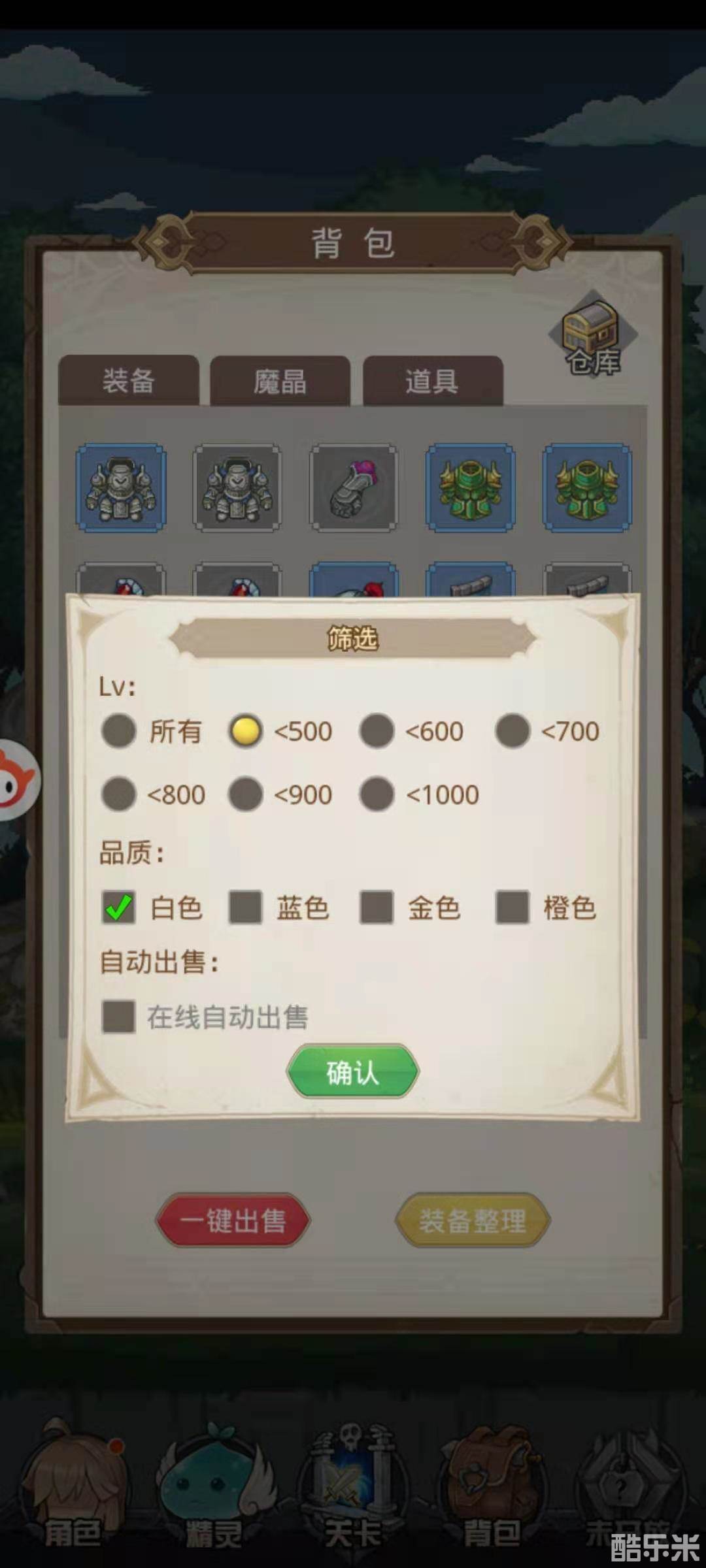 也就是说,当玩家在离线挂机后,游戏自动打怪获得的低品质装备是可以系统直接出售,这样一来背包绝对不会满,而且比较贴心的是,自动出售是可以调节品质和lv的。而且出售完获得的金币在后期也是比较有用的,因为后期升级物品会比较费金币,大家都会缺钱的。