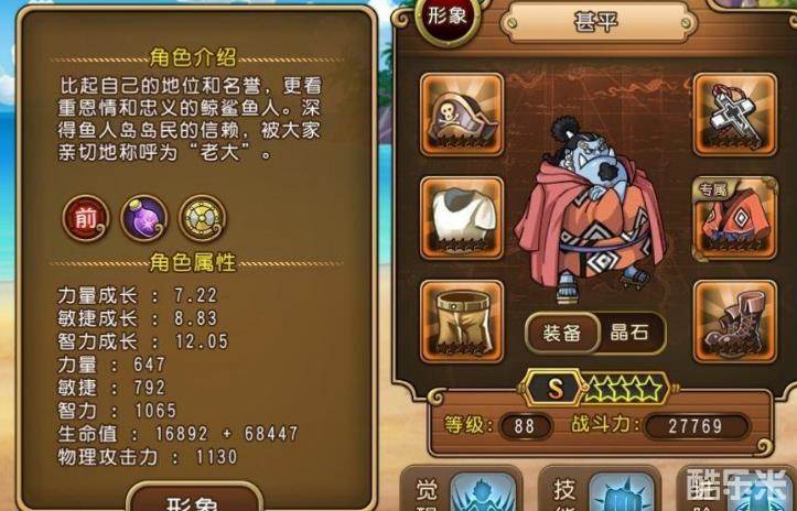 跟其他角色不同,甚平需要许多装备、训练、宝石等资源,进行良好的培养。甚平和鹰眼一样,它们属于后期英雄,自身的六星与八星天赋非常强大。