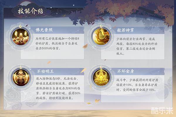 战斗中少林获得的所有护盾值提升10%,当自身存在护盾时,受到的伤害会减少15%。