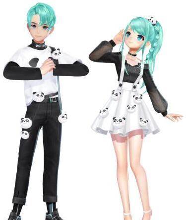 黑白的视觉冲击快速抓住了眼球,令人眼前一亮。男生翠绿的发色加上牛仔裤与黑白长短袖叠穿的搭配,既休闲又前卫;女生的黑色上衣搭配着布满熊猫玩偶的白色背带裙,显得俏皮又可爱。