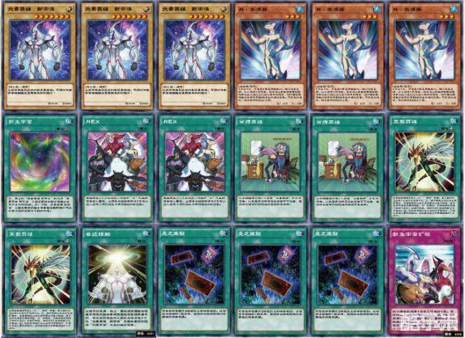 卡牌顺序:元素英雄 新宇侠×3 N 水海豚×3 新生宇宙 NEX×2 至爱英雄×2 奇迹接触 无之炼狱×3 新生宇宙扩张×3