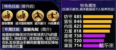 抢篮板时,马龙将降低所有对方球员12%的篮板能力!在自己能够提前知道篮板球落点且自身拥有高额投篮命中率的情况下,搭配强力专属,可以让整个团队获得更多的篮板球!