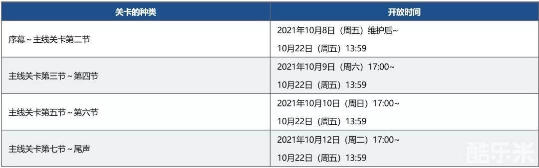 包含剧情的主线关卡将按照以下日程开放。推进主线关卡,将解锁掉落活动道具的自由关卡。继续推进主线关卡和通关自由关卡,将解锁后续的自由关卡。