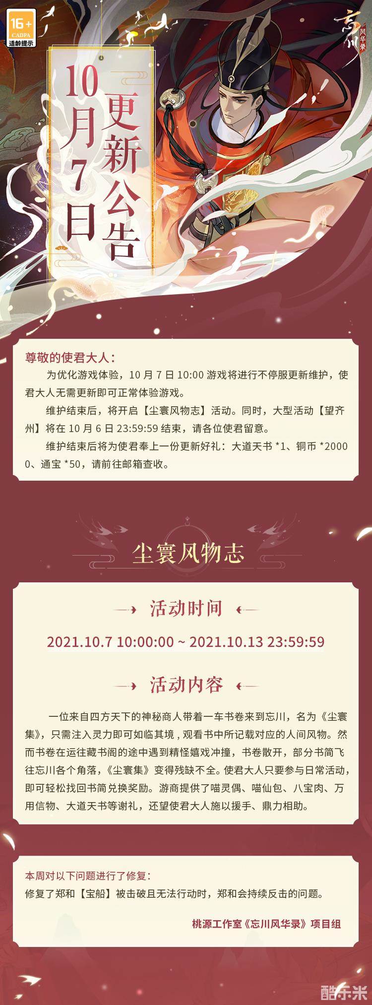 为优化游戏体验,10月7日10:00游戏将进行不停服更新维护,使君大人无需更新即可正常体验游戏。