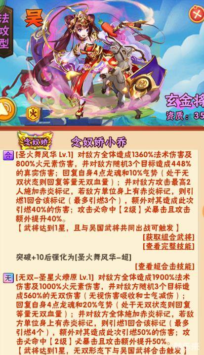 吴国拥有的引燃技能机制,可以打出爆炸的伤害效果,使输出能力大幅提升。念奴娇小乔进一步强化了阵容的灼烧能力,大幅增加了灼烧的伤害系数,且自身就具备引爆、蔓延体系,维持火烧的伤害与续航,从而逐步提升对抗优势,并最终一击制敌。