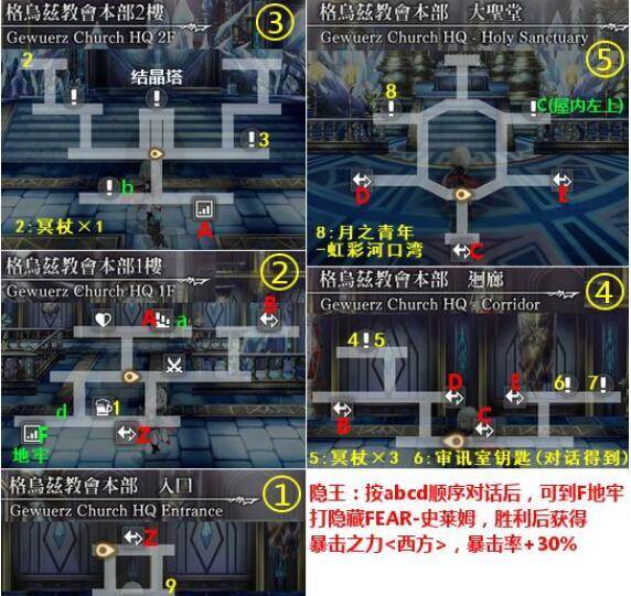 宝箱:1~9,其中2是冥杖×1,5是冥杖×3,6是审讯室钥匙(完成第6话后和审讯室内男子对话得到)
