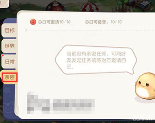 玩家需要做这个亲密任务,玩家可以点击目标。然后在目标栏的最下角,可以看到这个亲密,然后可以选择发出邀请。可以选择这个邀请好友,每天可以做十个亲密任务,每个大概可以增加5-10点亲密度。