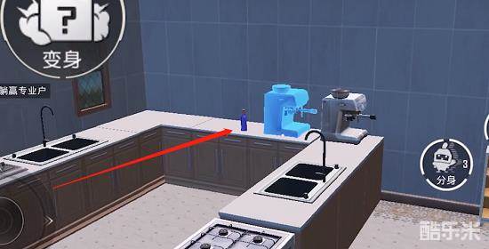 2、躲猫猫厨房中的洗手台上面有一个酒瓶,大家可以对准酒瓶变身,这个东西体积更下,会让敌人不容易发现。
