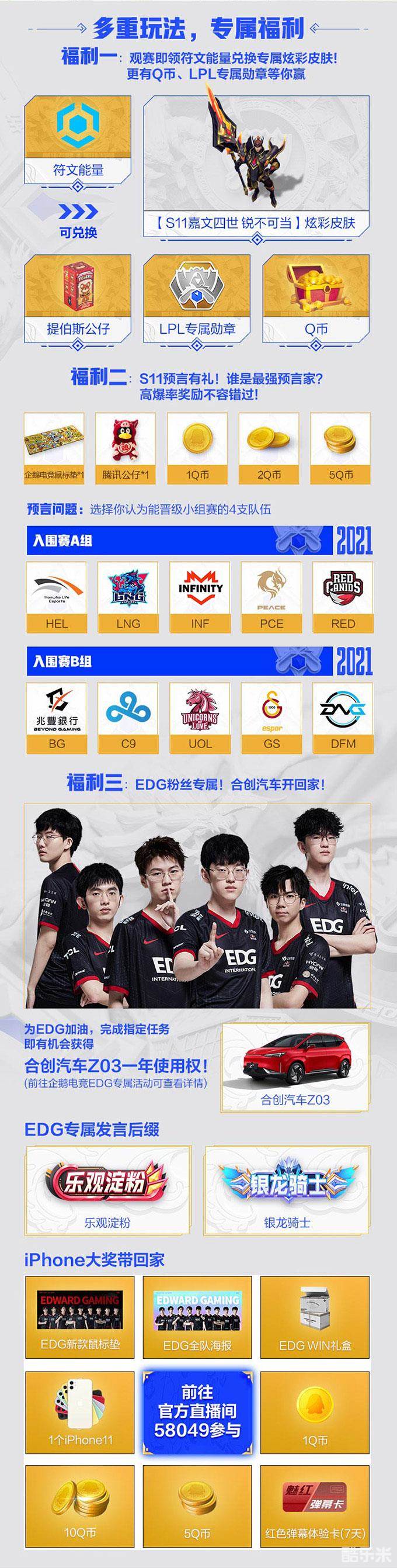 来企鹅电竞直播间58049,观赛即可领取符文能量兑换专属炫彩皮肤。在直播间观看一定时长即可获得抽奖次数,海量Q币,鼠标垫,公仔手办等奖品应有尽有,更有EDG携手合创汽车给大家带来的福利!还不赶紧来和鹅妹一起抽iPhone,赢汽车使用权!