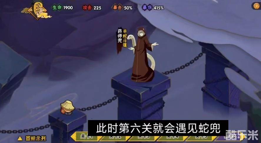 2、第一关出现药师兜的时候,不要打死,打到一定血量会提示药师兜要逃跑,你让他逃跑,之后第六关就是半蛇兜。