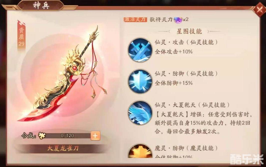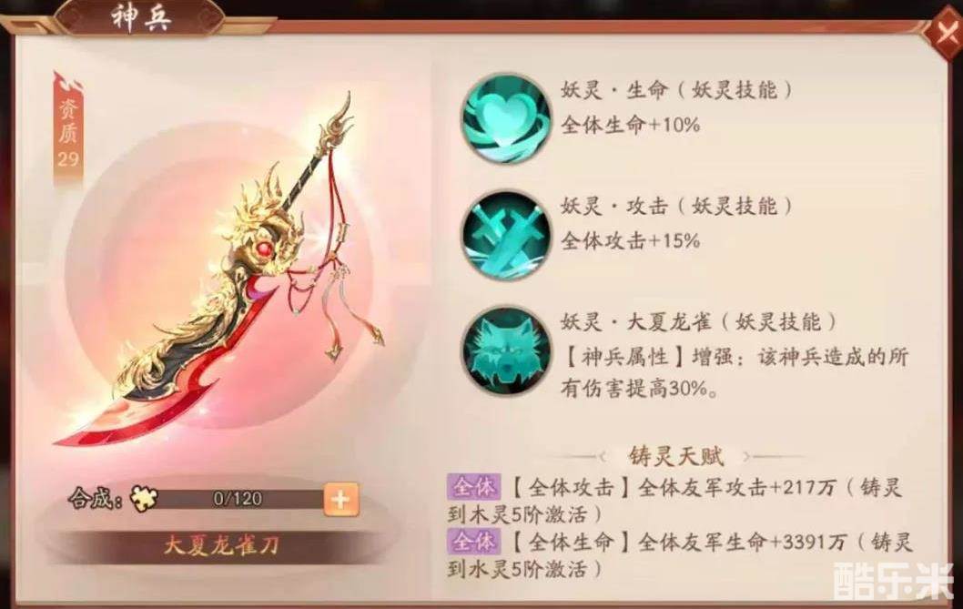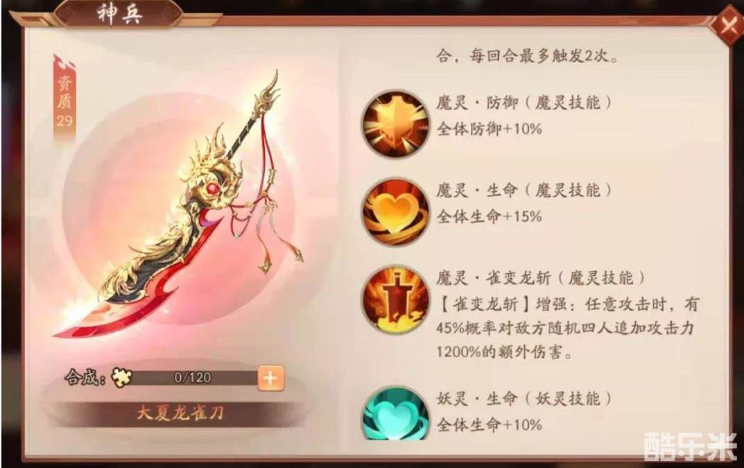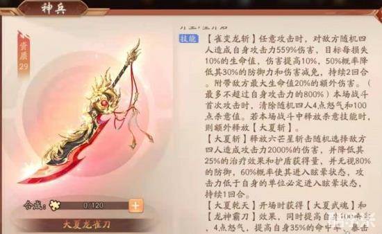 言归正传,首先我们先来定义一下大夏龙雀刀。从第一把赤金神兵的技能与效果而言,可以很明确,这是一把攻击类型的神兵。在小编的眼中,所有的紫金六武将,都是大夏龙雀刀的潜在受益者,只不过阵营不同,武将特点不同,使用过后的效果也不尽相同。
