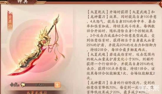【大夏武魂】若造成伤害时,攻击范围内的敌人血量及护盾变化小于30%,则额外获得一个行动回合,并提高自身10%的攻击力,持续1回合。该效果每回合仅能触发1次。全场仅能触发2次。 【龙神霸刀】自身的行动阶段内,受到的任意伤害降低40%。每受到一次伤害,伤害降低效果减少20%,最多减少40%。