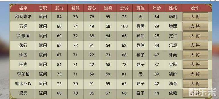 统御则会影响带兵数量。政治会辅助文官的建设。野心会影响反抗几率如果数值已经达到60以上则需要小心。